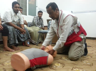 حيث تلقى المشاركين في اليوم في الاول التي يدرب فيها المدرب الدولي / عصام غيثان على مجموعة من المعلومات الاساسية عن الهلال الاحمر النشأة وكذلك عن شروط المسعف او مجموعة من المبادئ والقيم التي يجب ان يتحلى بها المسعف عن طريق الاسعافات الاولية في الحالات المتعددة الواعي او الغير واعي كما قام المشاركين بعمليات تطبيقية على كيفية عمل الاسعافات الاولية للمصابين .