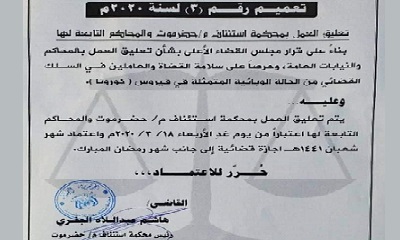 ويأتي القرار بناءً على قرار مجلس القضاء الأعلى بشأن تعليق العمل بالمحاكم والنيابات العامة، وحرصاً على سلامة القضاة والعاملين في السلك القضائي من الحالة الوبائية المتمثلة في فايروس كورونا المستجد